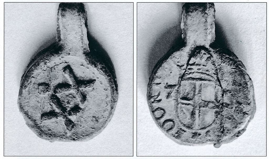 98/9 : Qui pourrait m’en dire plus sur ce sceau de la famille d’ESTOURMEL. Il s’agit d’une pince qui semble être en plomb, mesure 2 centimètres de diamètre et qui devait pouvoir s’ouvrir par le haut qui est recourbé. On voit sur la tranche qu’il devait y avoir deux parties mais on ne sait pas l’ouvrir. Les deux faces de la pince devaient se replier par le haut.